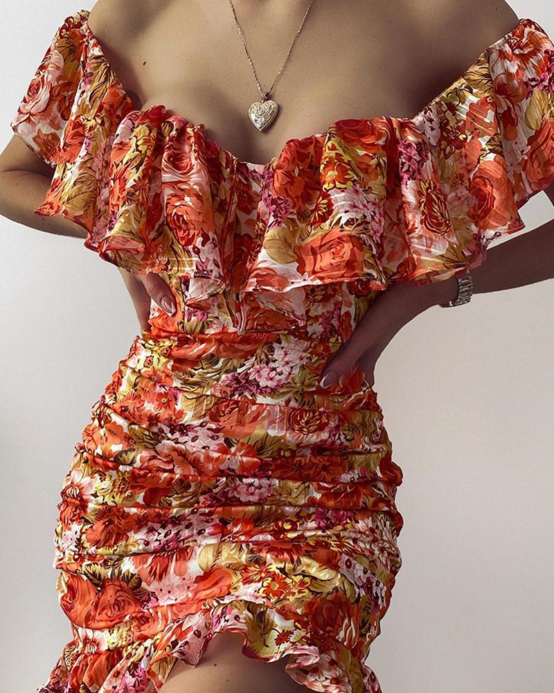 Off Shoulder Ruffles Ruched Floral Print Dress, Orange
