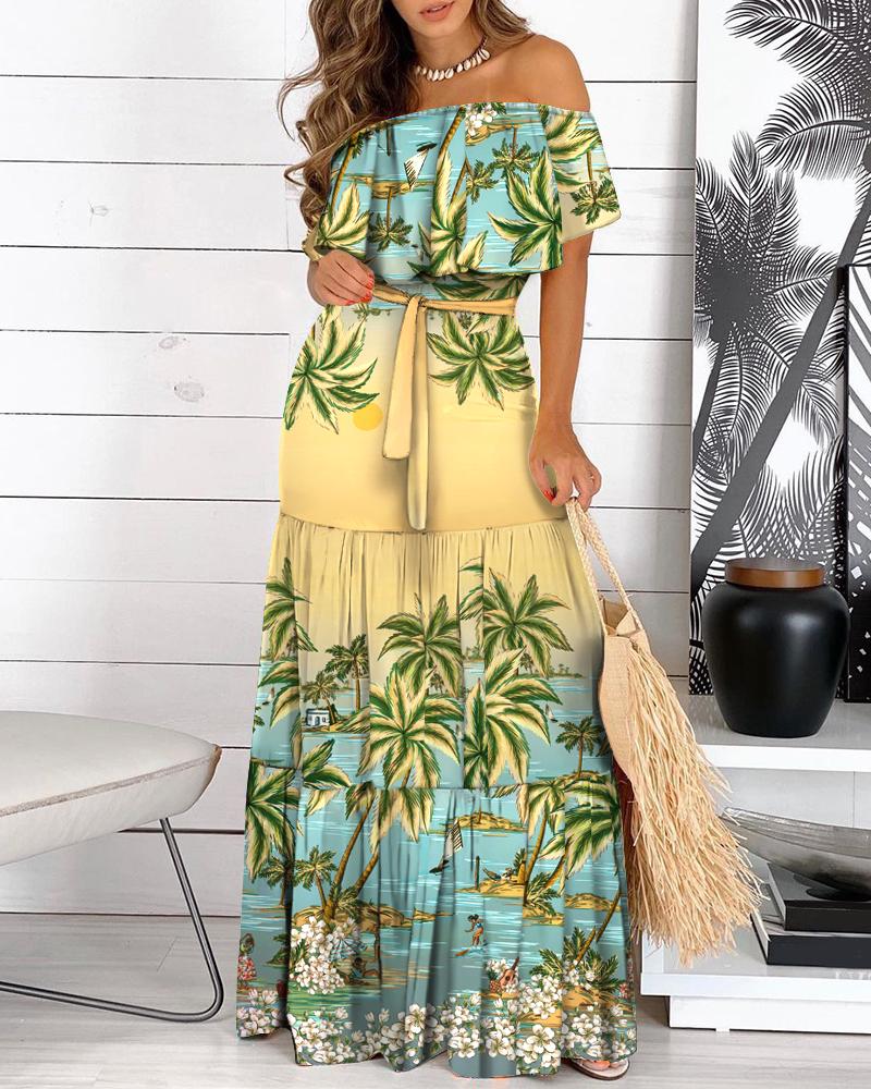 Off Shoulder Tropical Print Ruffles Maxi Dress, Multicolor