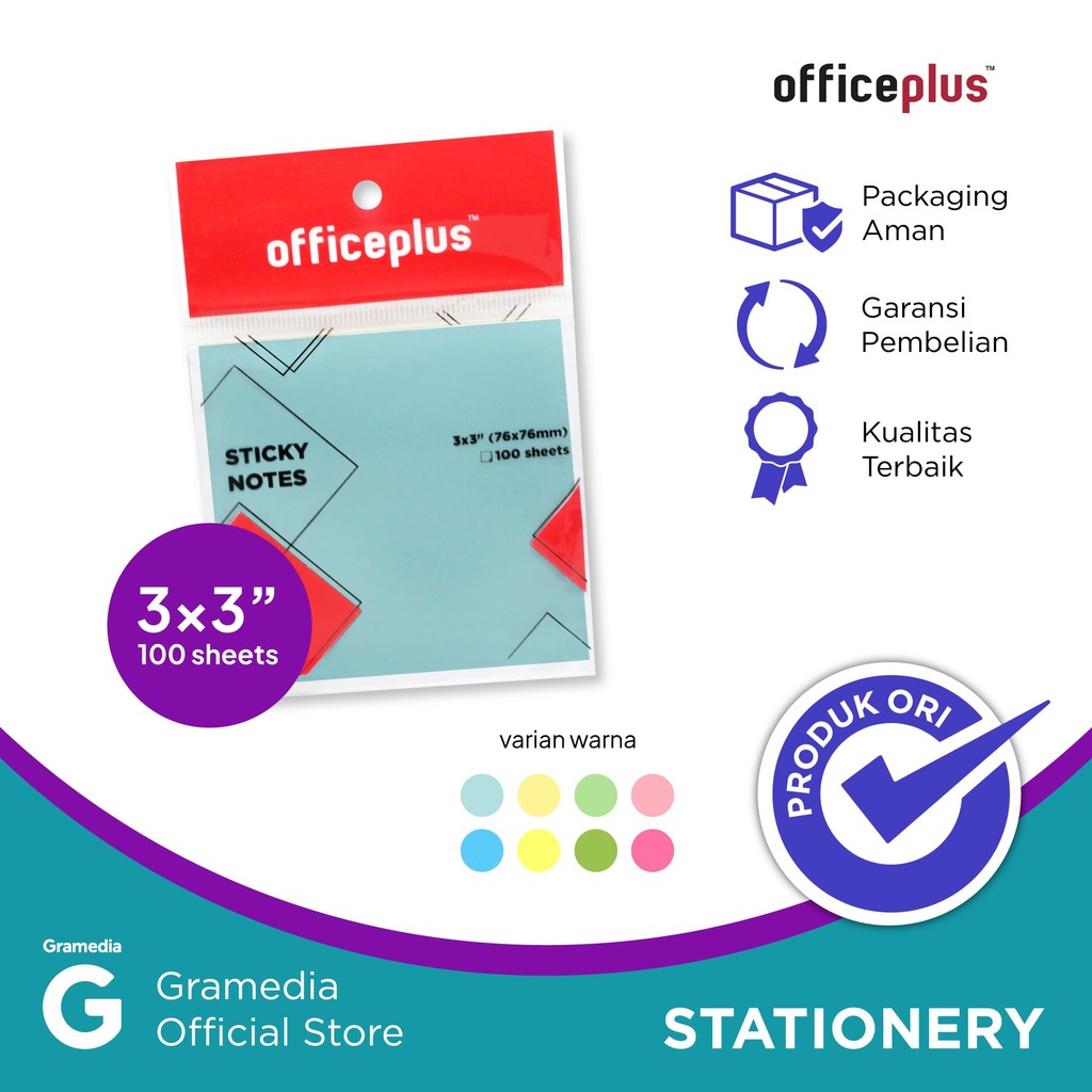 Office-Plus Sticky Note 3x3 100 Sheet Blue Notes dengan warna pastel soft dan ramah lingkungan, bahannya ringan, lem perekat yang digunakan tidak mudah lepas juga tidak akan merusak permukaan yang ditempelkan. Memiliki bentuk classic dan simple membuatnya diminati banyak kalangan. Kertasnya juga mudah ditulisi. Size: 3x3 Warna: Blue Isi: 100 Sheets/Pad