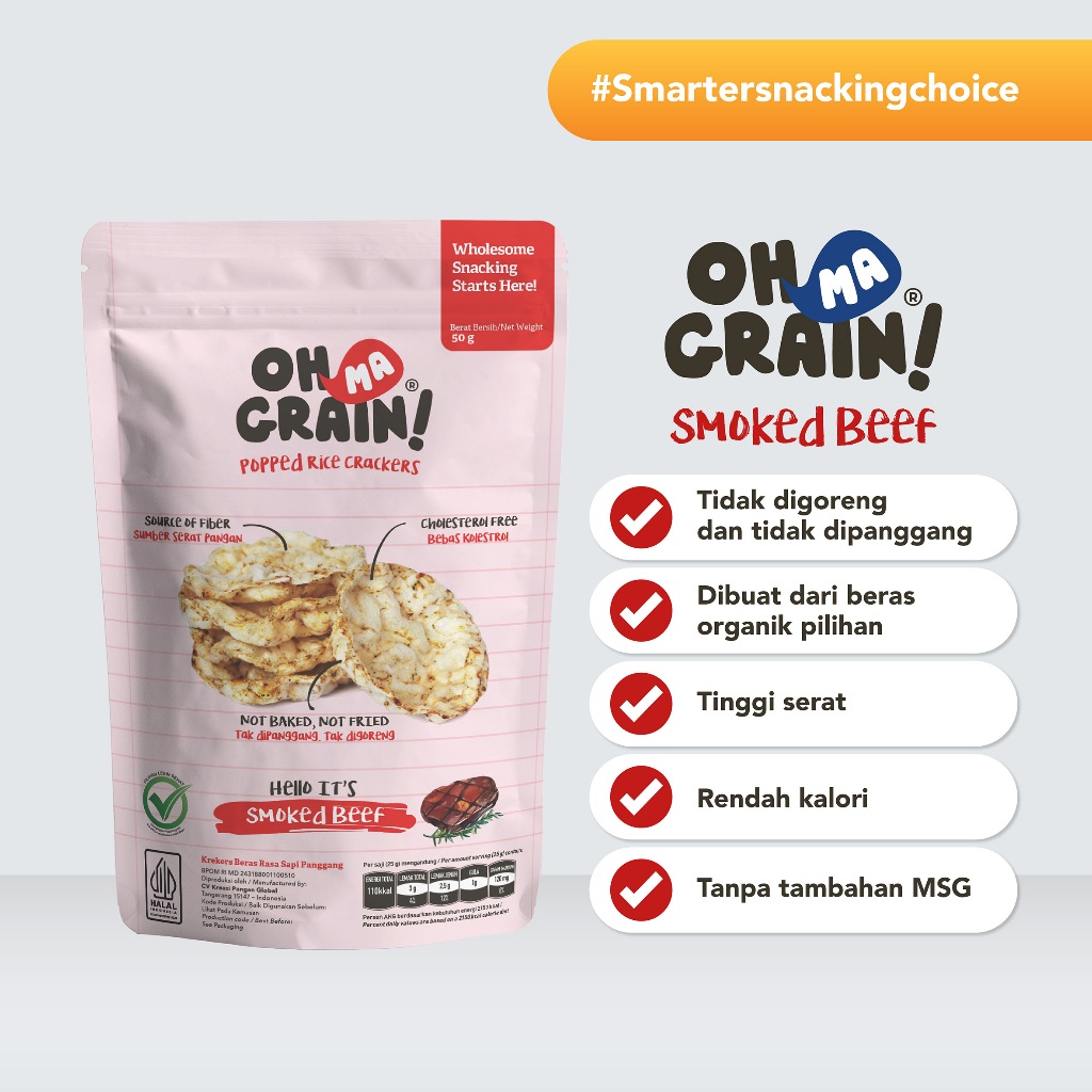 Oh Ma Grain adalah snack beras yang terbuat dari campuran beras coklat dan beras putih organik. Proses pembuatannya tidak dipanggang, tidak digoreng, tapi menggunakan popping technology.