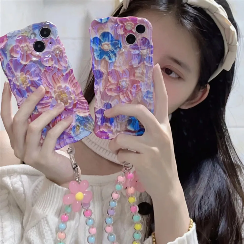 Oil Painting Blu-ray Camellia Silicone Phone Case For iPhone 13 12 11 14 Pro Max Creative Rhinestones Pearl Chain Bracelet Cover
