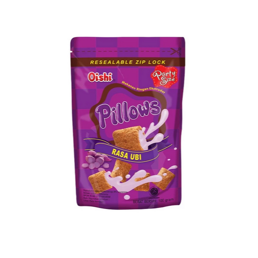 Oishi Pillows Ubi adalah satu-satunya camilan modern yang rasanya membuat para penikmatnya penasaran. Cemilan ini sudah menggoda hanya dengan melihat kemasannya. Spon renyah-lembut yang dibuat dari jagung dan beras dilumuri dengan lelehan cokelat yang membuat cokelat meresap dan terkunci dalam pori-pori spon-nya.