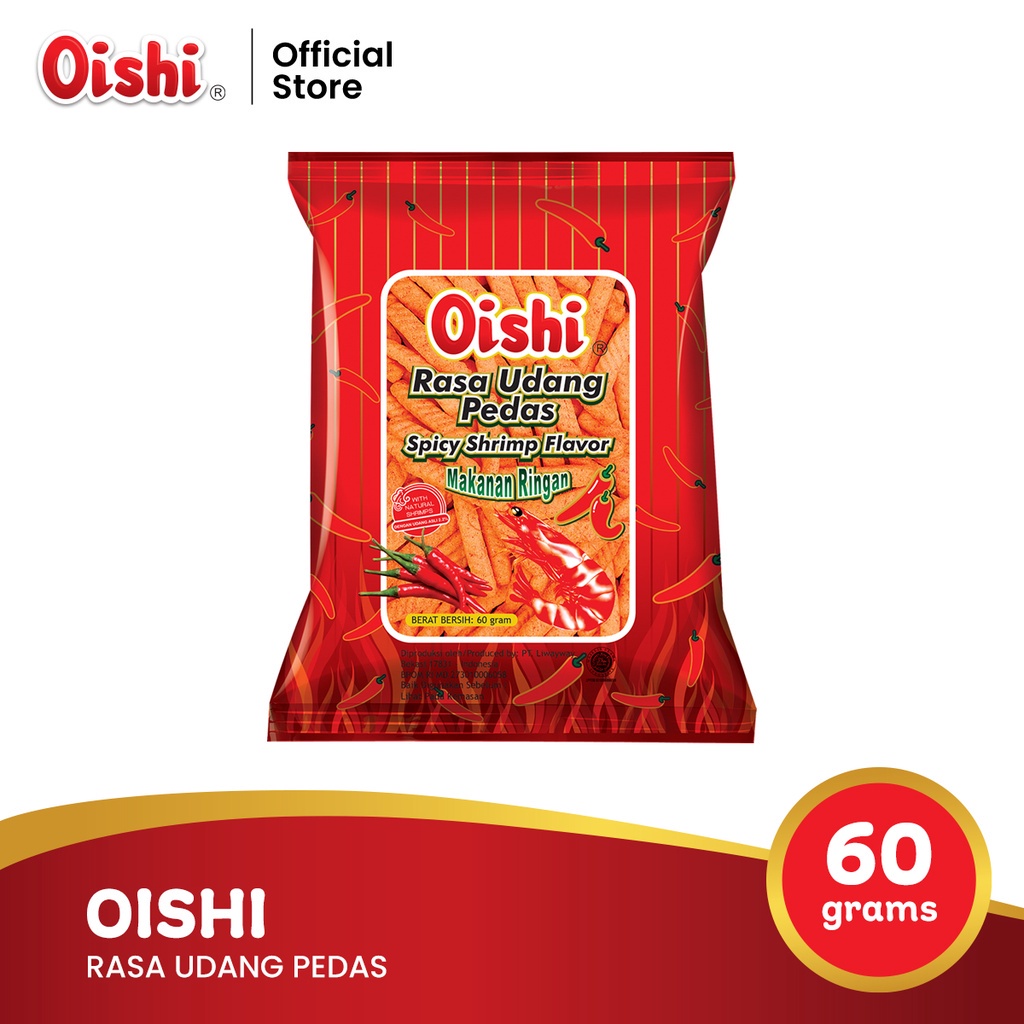 Oishi udang pedas Produk makanan ringan yang berkualitas dengan rasa udang pedas yang enak dan lezat cocok untuk menemani waktu luang anda.