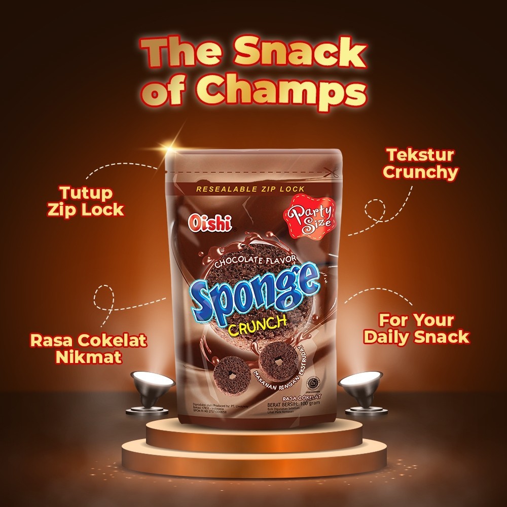 Oishi Sponge Coklat adalah snack dengan bentuk sponge lingkar yang unik. Tekstur sponge yang renyah dan rasa yang manis semakin menambah unik snack dari Oishi ini. Oishi Sponge Crunch hadir dalam kemasan yang praktis dan higienis serta dilengkapi dengan resealable zip lock untuk menjaga kerenyahan sponge crunch di dalamnya.