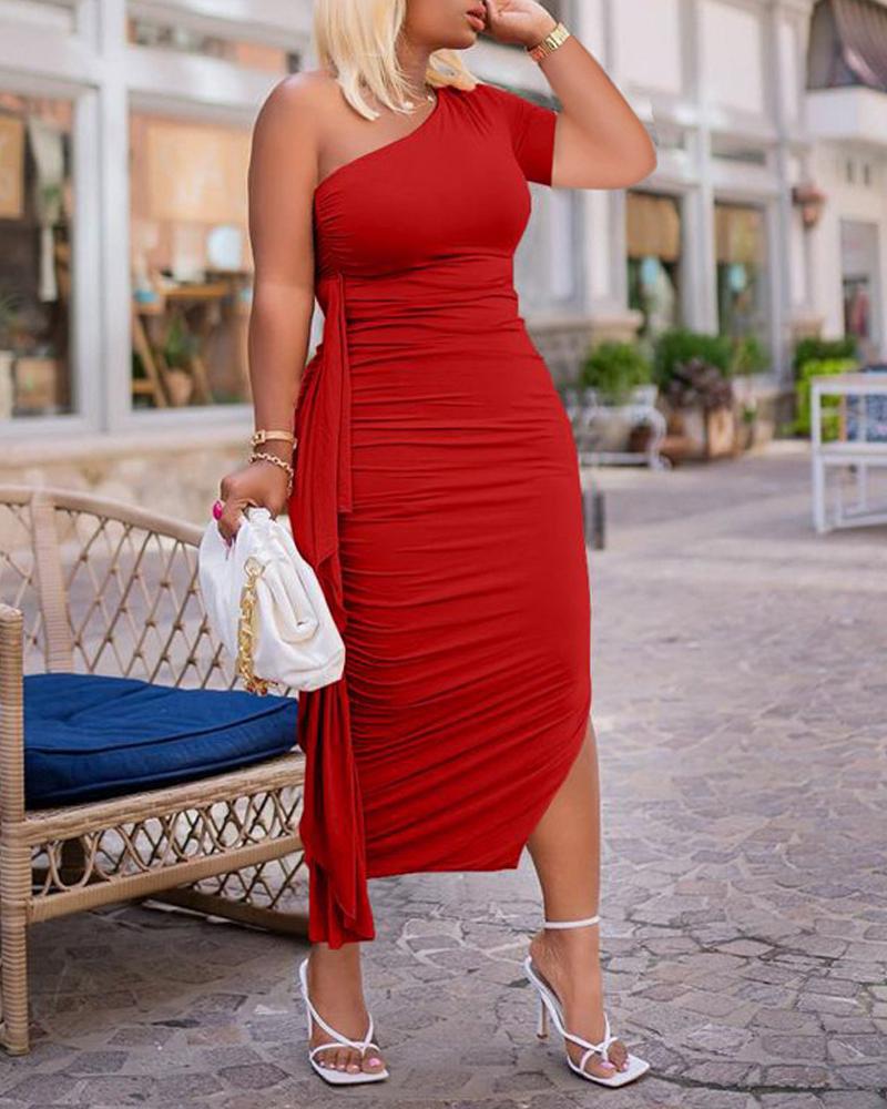 One Shoulder Draped Side Ruched Slit Bodycon Dress, Red