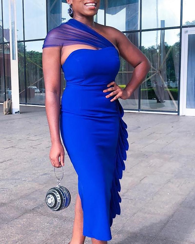 One Shoulder Mesh Insert Ruffles Slit Bodycon Dress, Blue