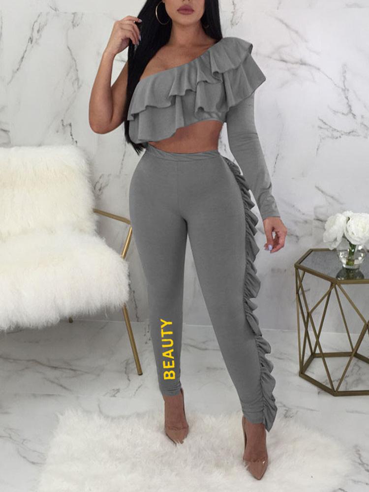 One Shoulder Ruffles Design Pants Set, Red;blue