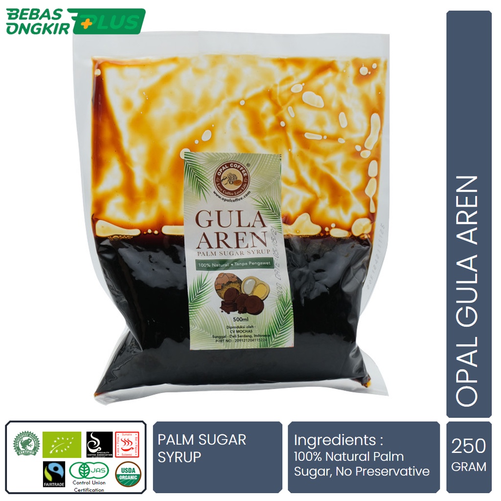 Opal Gula Aren Palm Sugar Syrup merupakan produk sirup gula aren alami yang dipanen dan diproses dari gula merah pilihan terbaik dengan proses alami dan tanpa bahan pengawet.
