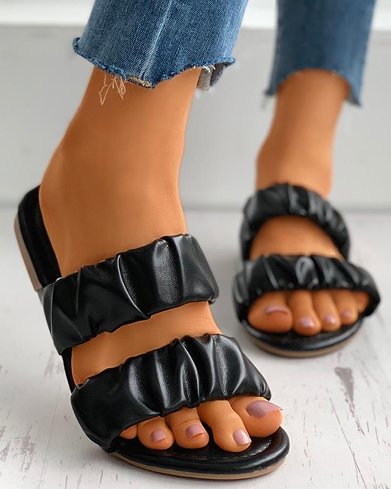 Open Toe Ruched Detail Flat Slider Sandals, Black