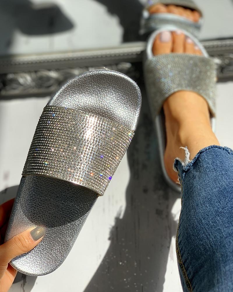 Open Toe Studded Design Flat Sandals, Silver