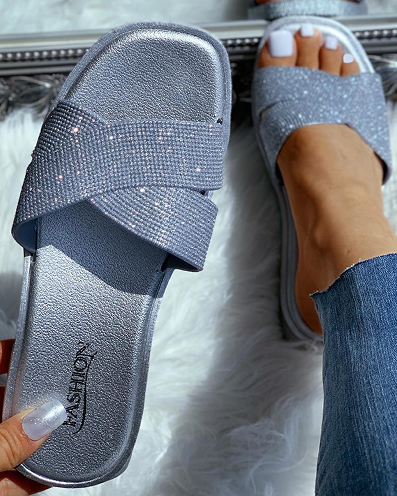 Open Toe Studded Flat Sandals, Silver