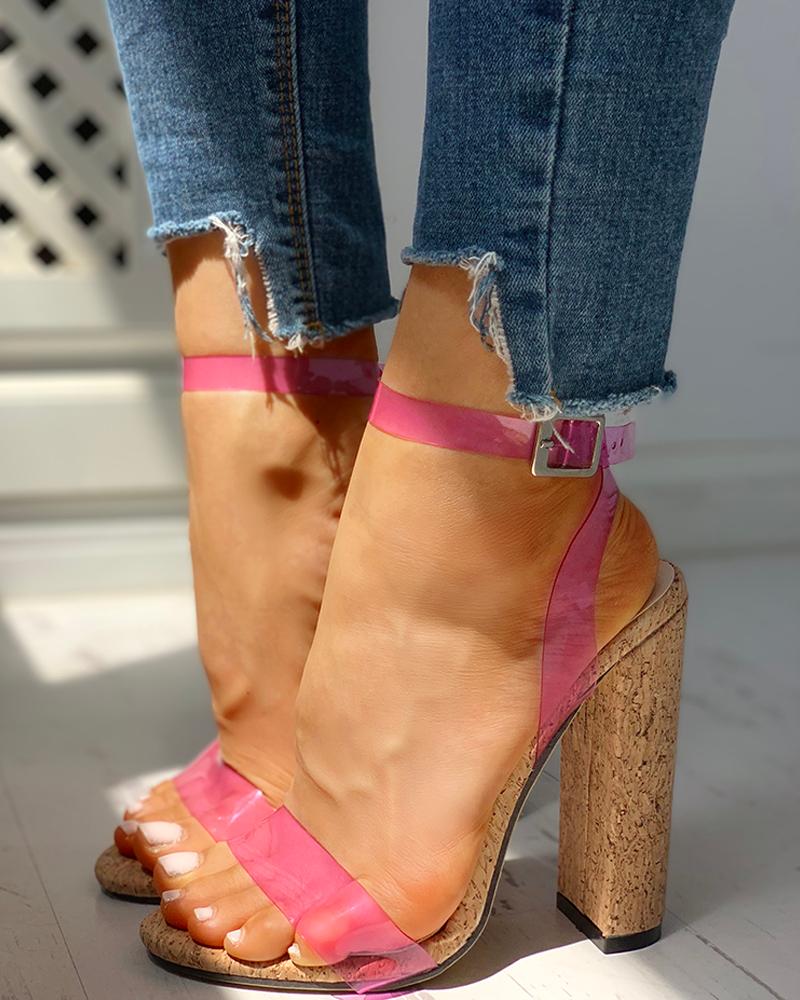 Open Toe Transparent Strap Chunky Heeled Sandals, Pink