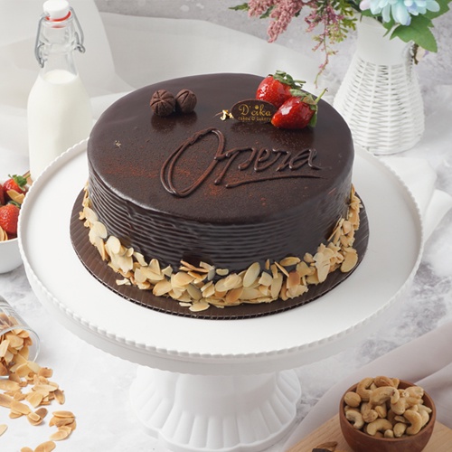 Opera Cake coklat dengan lapisan coklat tiramisu dan almond