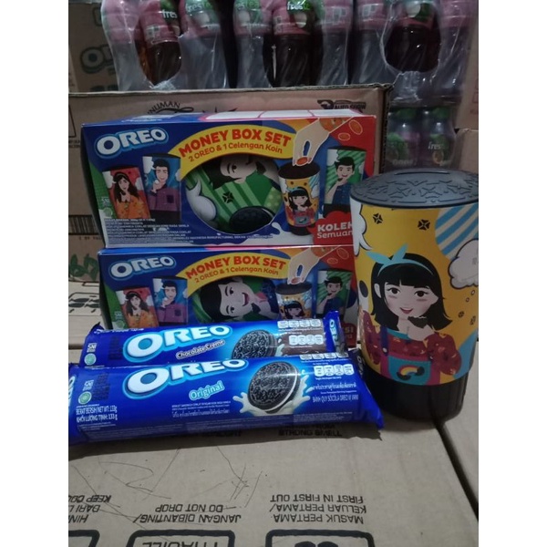 di dalam kemasan box terdapat 2 variant oreo rasa vanilla dan coklat hadiah celengan yg menggemaskan