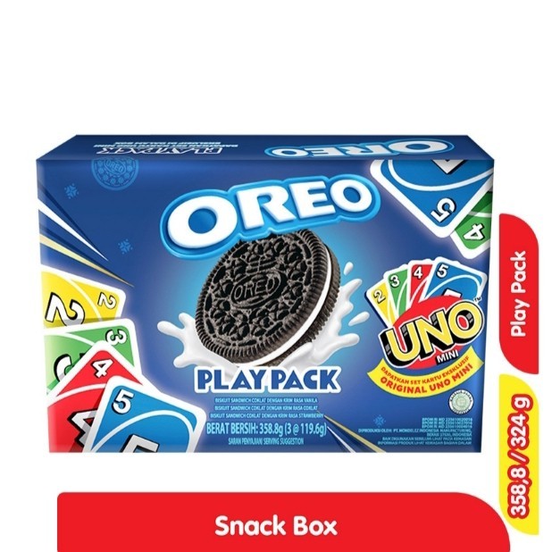 OREO Play Pack Snack Box 324 g adalah paket makanan ringan berupa beberapa jenis varian biskuit cokelat isi oreo. Dibuat menggunakan bahan bahan pilihan berkualitas dan resep rahasia yang telah melegenda, membuat biskuit ini memiliki rasa yang lezat. Biskuit cokelat isi berwarna hitam pekat dengan isian krim vanilla di antaranya, memberikan perpaduan rasa manis yang nikmat. Memiliki tekstur biskuit yang renyah dan isian krim yang creamy menghasilkan perpaduan tekstur nikmat. Dicetak dalam bentuk bulat yang pas dalam satu gigitan. Akan lebih nikmat jika dikonsumsi bersama dengan susu sebagai topping celupan untuk biskuit. Susu yang meresap kedalam biskuit semakin menambah citra rasa nikmat dari biskuit. Cocok dijadikan cemilan untuk semua kalangan, mulai dari anak anak hingga orang dewasa. Jadikan OREO Play Pack Snack Box sebagai hampers dan bingkisan andalan anda.