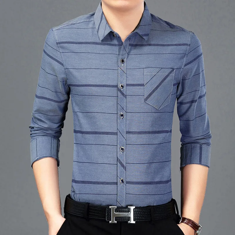 Multicolor, algodón, motivo de franja vertical, cuello clásico, cierre con botones en la parte delantera, manga larga y dobladillo curvo en la parte posterior.