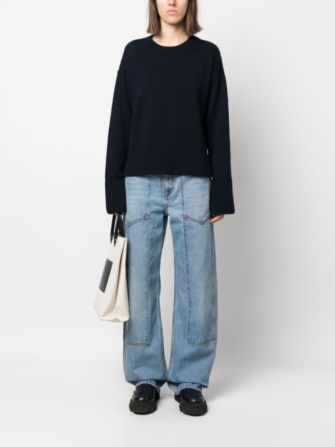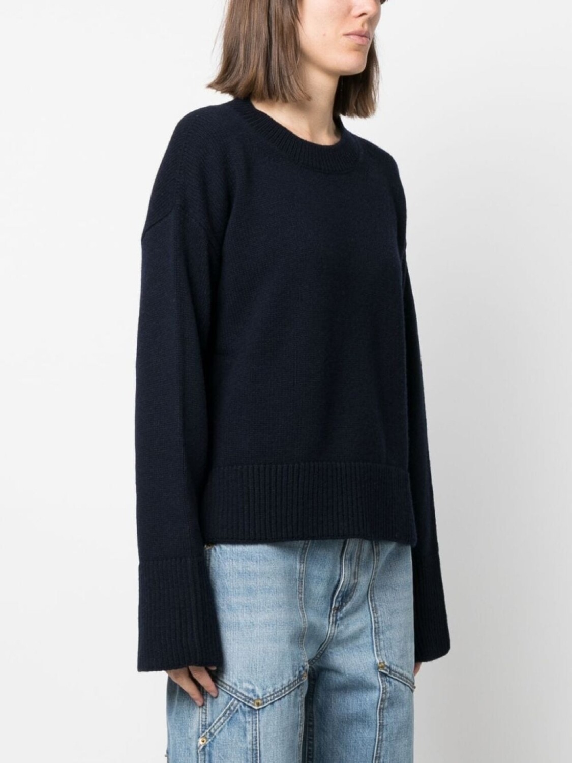 Темно-синий, шерсть, трикотажный материал, круглый вырез, приспущенные плечи, длинные широкие рукава, манжеты с разрезами и прямой подол.