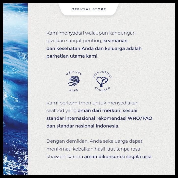 Semua produk kami adalah hasil tangkapan segar yang bebas dari bahan kimia (pengawet, pemutih, formaldehida) dan juga aman dari merkuri.
