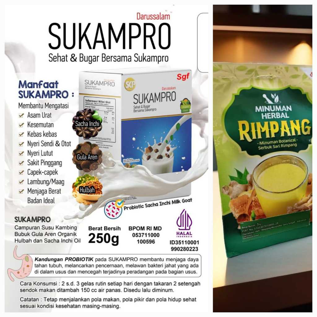 Campurkan 2 sendok makan Sukampro, 1 sachet Saripati Rimpang, dan 200cc air panas. Aduk rata, lalu minum. Konsumsi dua kali sehari selama 5 hari berturut-turut. Jika setelah 5 hari ada perbaikan meskipun belum sembuh total, lanjutkan konsumsi selama 5 hari lagi. Total terapi 10 hari. Sukampro berfungsi sebagai terapi pendukung untuk mengatasi berbagai masalah kesehatan, terutama yang berkaitan dengan **organ gerak**, seperti: