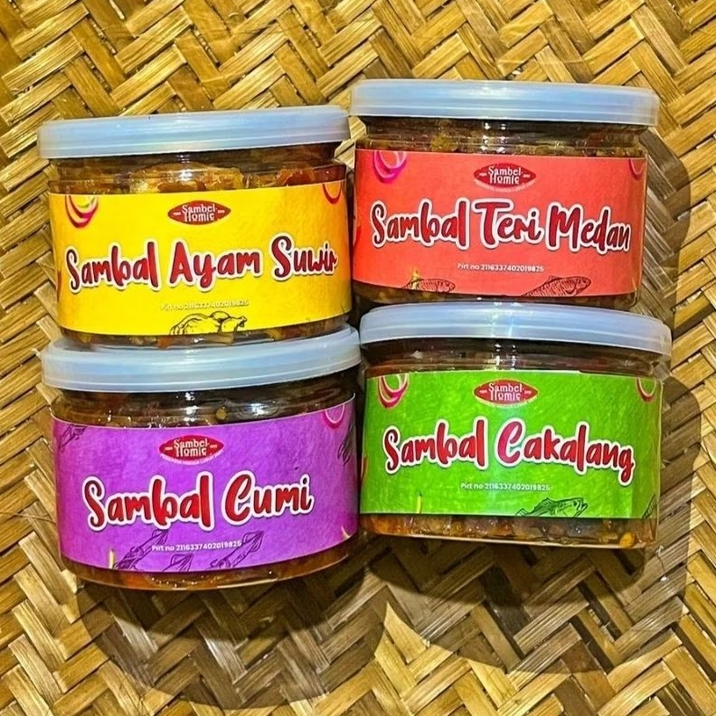 Isi 4pcs sambal kemasan varian cumi, ayam suwir, cakalang dan teri medan.
