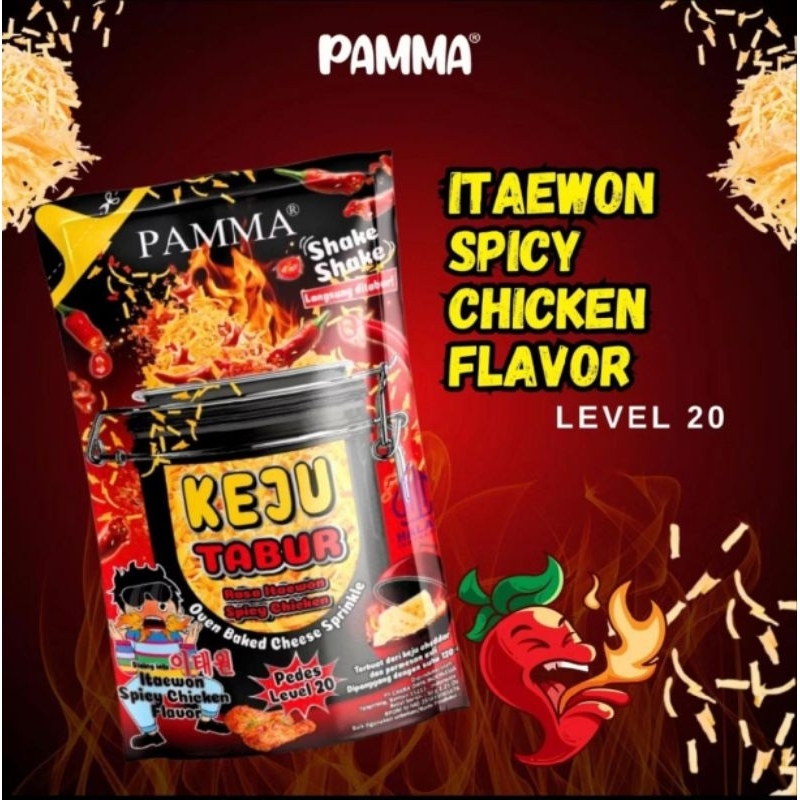 Keju (82,4%) (Mengandung Susu, Pengawet Kalium Sorbat dan Nisin), Cabe(10%), Bumbu Rasa Ayam (Mengandung Kedelai, Ayam 1,6%, Penguat Rasa (Mononatrium Glutamat Dinatrium Inosinate), Pewarna Sintetik (Kuning FCF CI No. 15985), Pemanis Buatan Aspartame), Bawang Putih, Gula, Garam, Oregano, Minyak Cabai.