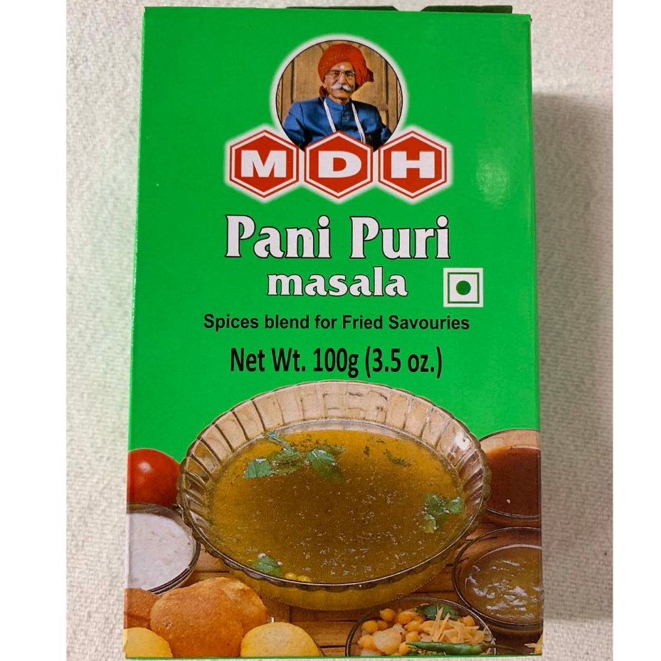 MDH PANIPURI PANI PURI MASALA Campuran bumbu untuk Gorengan Gurih Resep : Campurkan satu sendok teh penuh Pani Puri masala ke dalam segelas air dingin dan aduk. Air berbumbu yang sangat lezat akan siap untuk Puri. Masala ini bisa digunakan untuk menambah semangat Dahiwada, jus buah, juga susu mentega. Komposisi : Garam beryodium, Garam hitam, Mangga kering, Jintan, Asam Jawa, Asam Sitrat, Daun Mint, Kachri, Jahe Kering, Cabai Kuning, Lada Hitam, Kunyit, Cengkih, Asafoetida.