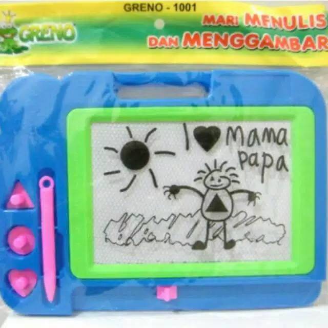Terdiri dari papan tulis magnet hapus, pena magnet/tanpa tinta, cetakan/stempel berbentuk hati, segitiga dan lingkaran. Bagus untuk melatih kreafitifas anak dan tidak mengotori lingkungan.