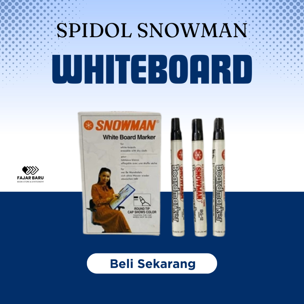 Spidol Snowman Whiteboard adalah spidol yang dirancang khusus untuk digunakan pada papan tulis (whiteboard). Spidol ini memiliki ciri khas dengan tinta yang mudah dihapus dan tidak meninggalkan bekas. Berikut adalah beberapa deskripsi dari Spidol Snowman Whiteboard: