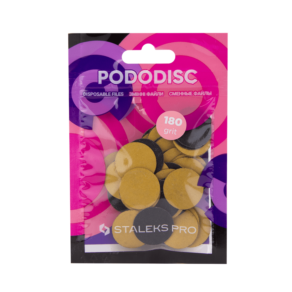 Сменные файлы для педикюрного диска ТМ Staleks среднего размера М диаметром 20 мм жесткость 180 грит. Одноразовый файл представляет собой абразивную крошку, нанесенную на бумажную основу с клейким слоем. Перед закреплением файла снять защитную пленку. Педикюрный диск - современный инструмент, который обеспечивает быструю и эффективную работу мастера. Сменный файл является одноразовым, поэтому вы можете быть спокойны: процедура полностью безопасна для здоровья клиента и мастера! Для начала необходимо закрепить диск в ручке фрезера и наклеить сменный файл ровно по центру, не выступая за края стального диска. Работать рекомендуется на скорости аппарата 25-26 тыс.об/мин., не касаясь кожи всей абразивной поверхностью. Для комфорта клиента, шлифуйте стопу отрывистыми движениями под углом около 45º. Использование педикюрного диска со сменным файлом позволяет выполнить обработку стопы за 10-15 минут. Диски поставляются по 50 шт. в упаковке: пакет или пакет+картонная коробка.