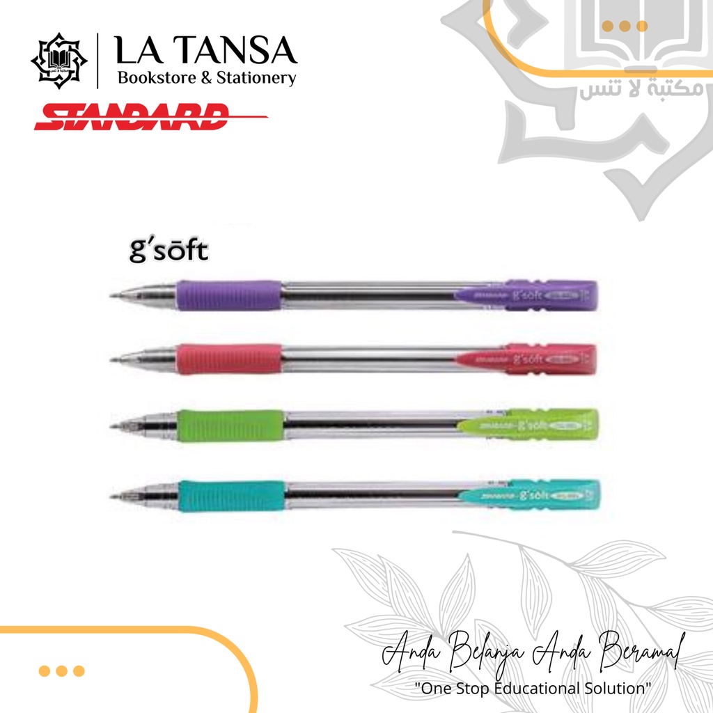 Standard Pen G'Soft 0.5 yang berbentuk Stick Pen, dengan Tinta Oil Gel, Tip Point 0.5 dilengkapi dengan Body warna warni cantik pada bagian Clip, End Plug, Rubber (Karet yang mudah digenggam dan nyaman untuk menulis), Tinta tersedia dengan warna Hitam (Body Bolpen Warna-Warni) dan Biru (Body Bolpen Warna Biru).