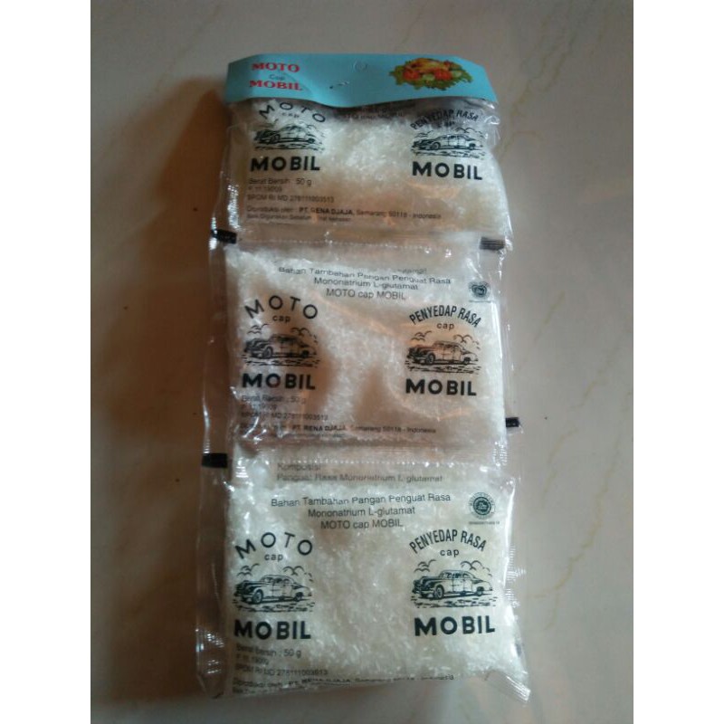 Bahan tambah pangan atau penguat rasa cap mobil ini diproduksi oleh : PT RENA JAYA, Semarang 50118 - Indonesia. Berat bersih dari moto cap mobil 50 g per sachet. 1 renteng berisi 10 sachet.Moto ini diguna untuk melezatkan makanan. Menjadi bumbu pelengkap di setiap masakan.