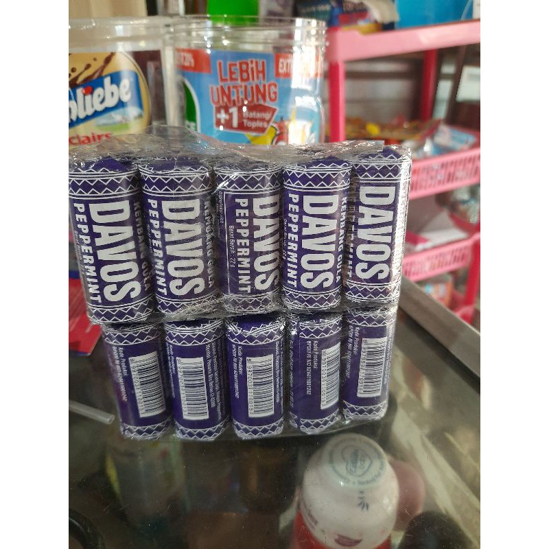 Permen davos dibungkus dengan kertas berwarna biru. Permen Davos terbuat dari gula pasir, menthol, dan bahan pengikat. Tidak ada zat pewarna, ...