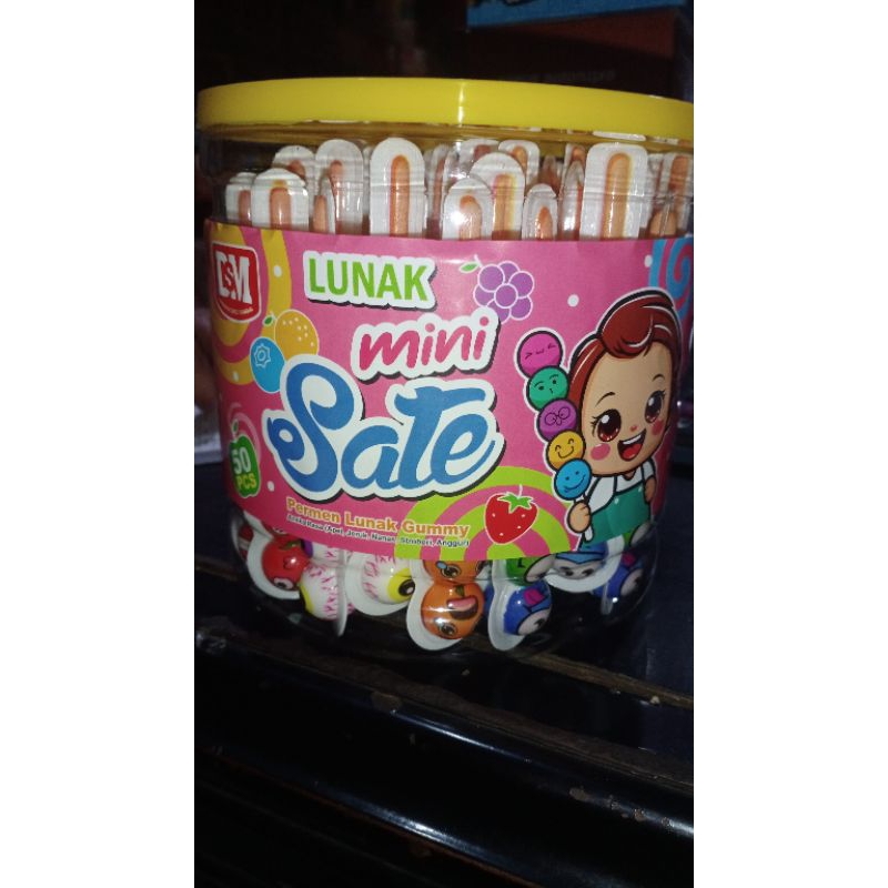 Permen lunak gummy jelly dengan bentuk mini sate by DSM. Isi 50 pcs per toples