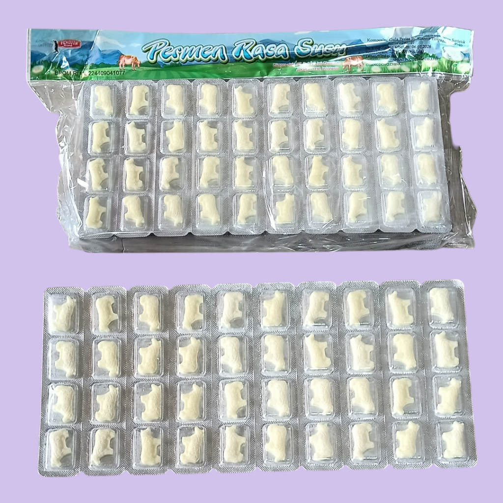 PERMEN SAPI Permen Rasa Susu Sapi [40 butir/lembar] merupakan permen dengan bentuk sapi dan dengan rasa susu sapi. Permen ini sangat lembuh saat dihisap dimulut, dengan rasa susunya yang enak menjadikan permen ini disukai segala usia. Permen ini permen jadul, permen yang terus eksis sampai hari ini. Dengan kemasan blister seperti obat, menjadikan permen ini mudah dibawa kemanapun.