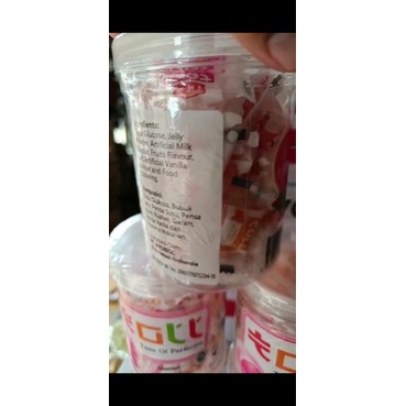 Komposisi : Gula, glukosa, bubuk jelly, perisa susu, perisa buah-buahan, garam, perisa vanila, dan pewarna makanan