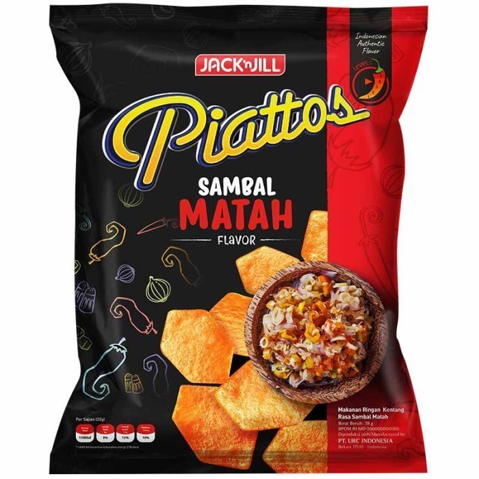Adalah keripik kentang berbentuk segi enam yang unik dengan tekstur yang tebal. Piattos dihasilkan dari kentang pilihan dan bumbu lezat yang akan menjadi kesukaanmu. Rasa sambal matah yang gurih dan unik akan membuat lidahmu bergoyang karena kelezatannya. Rasakan kerenyahan dalam setiap gigitan keripik kentang Piattos Snack Kentang Sambal Matah dan jadikan momenmu bersama teman-teman semakin seru dan rame.