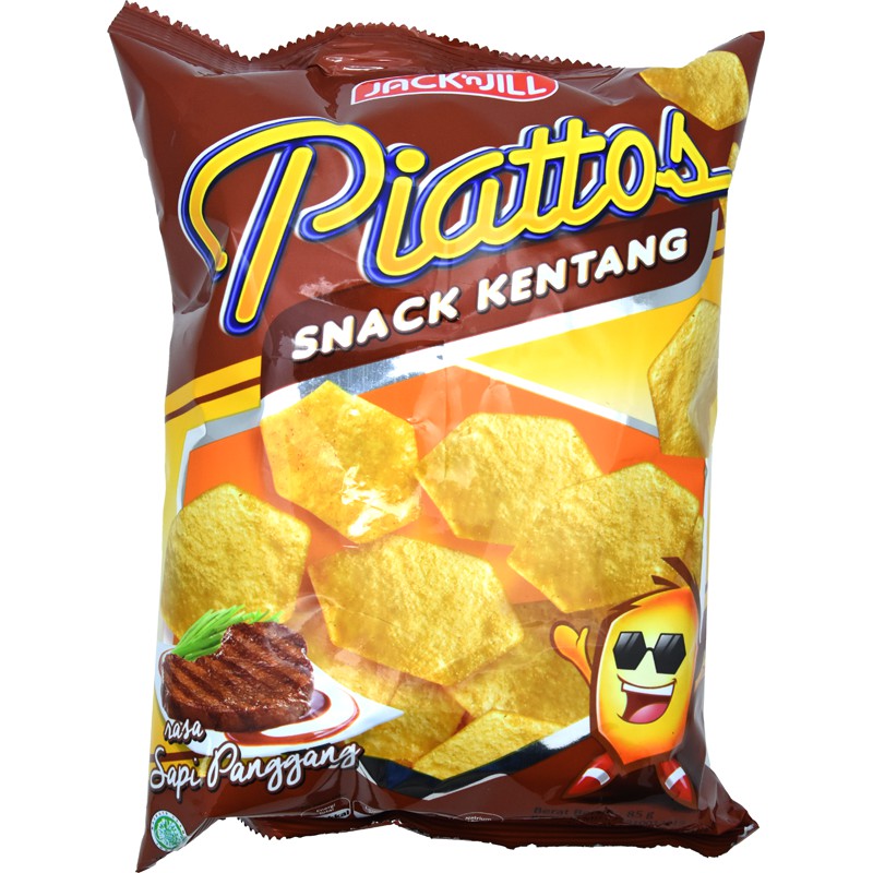 Berkumpul bersama teman-teman selalu terasa menyenangkan. Kapan pun, di manapun, ramenya canda dan tawa bersama orang-orang terdekat yang selalu ada untukmu adalah momen yang tidak akan pernah tergantikan. Camilan yang renyah dan gurih seringkali akan menjadikan momen-momen rame tersebut lebih asyik dan sempurna. Jadi, memilih camilan yang pas untuk momen seru bersama teman-teman sangatlah penting. Piattos adalah salah satu camilan renyah dan gurih yang dapat menjadi pilihanmu. Piattos Sapi Panggang 68gr adalah keripik kentang berbentuk segi enam yang unik dengan tekstur yang tebal. Piattos dihasilkan dari kentang pilihan dan bumbu lezat yang akan menjadi kesukaanmu. Rasa sapi panggang yang gurih dari Piattos Sapi Panggang akan membuat lidahmu bergoyang karena kelezatannya.