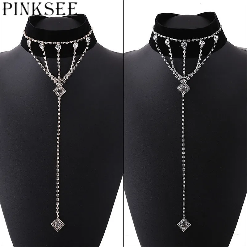 PINKSEE 1 Pc Black Velvet Choker Necklace With Long Crystal Tassel Chain Drop Fashion Gothic Elegant Jewelry Party Gifts