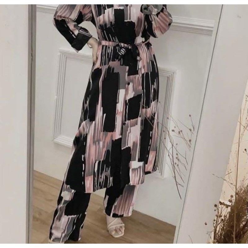 Setelan dengan model long tunik nichhh kak dan ini tunik full kancing yachhh ada tali lepas pasangnya juga
