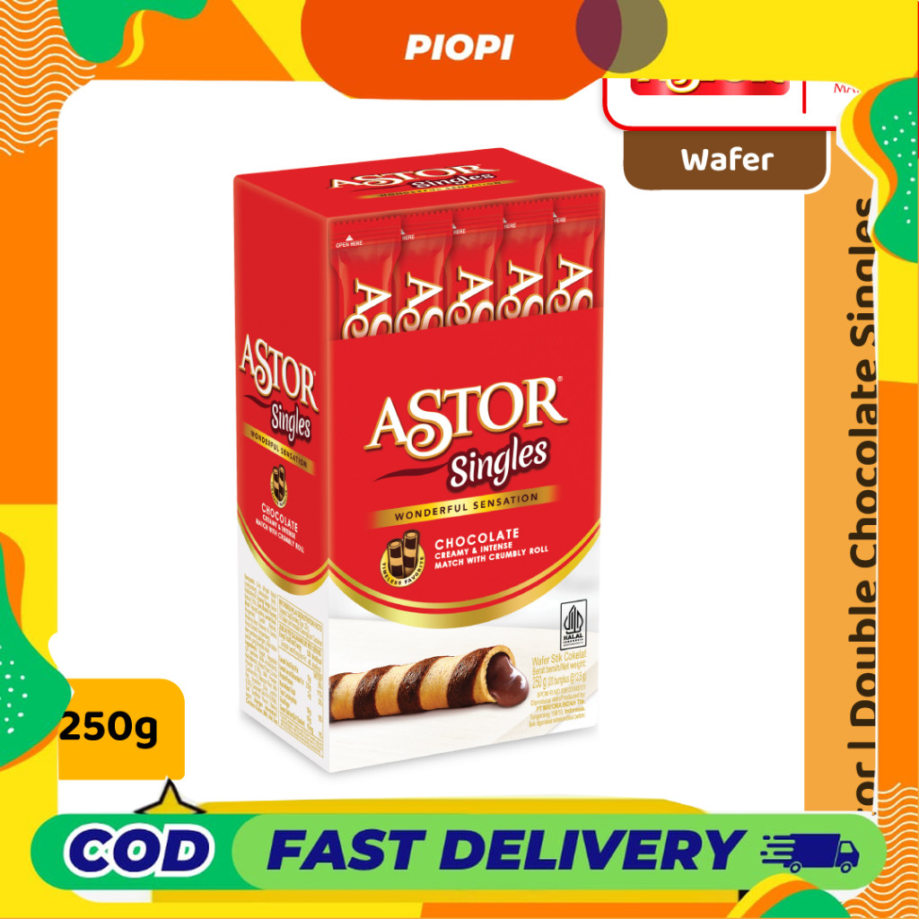 Astor Singles merupakan varian baru dari Astor yang hadir dengan kemasan satuan. Astor Singles merupakan paduan sempurna antara wafer renyah dan isi cokelat yang tebal & banyak.