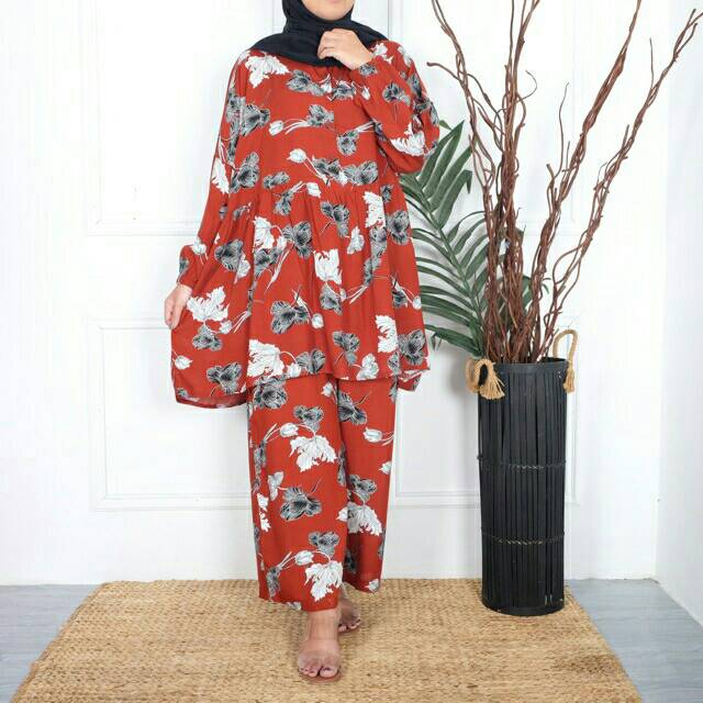 Set dengan atasan model babydoll ada kerutan bagian perut dan busui frendly ya ada bukaan kancing LD besar dan bentuk batwing