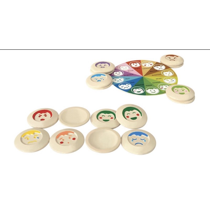 The set consists of 24 wooden tiles with 12 different emotions. Children can learn how to match two identical emotions with this fun memory game! Skills include learning about the relationship of colors and emotions. Emotion Color Wheel can help visually group feeling and practice emotion vocabulary.