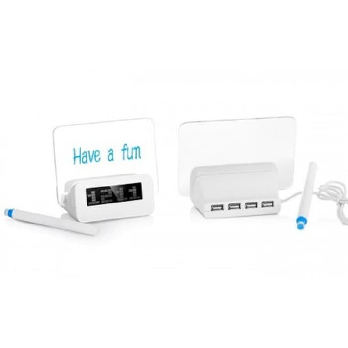 Jam alaram dengan papan tulis bagaikan memo notes. Dilengkapi dengan pengukur suhu digital, kalender, stopwatch dan juga alarm untuk mengingatkan hari ultah.
