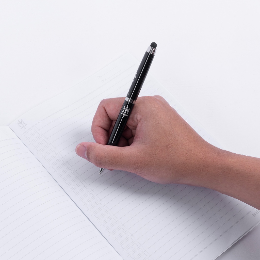 Black metal twist pen with engraving and capacitive stylus on the top.