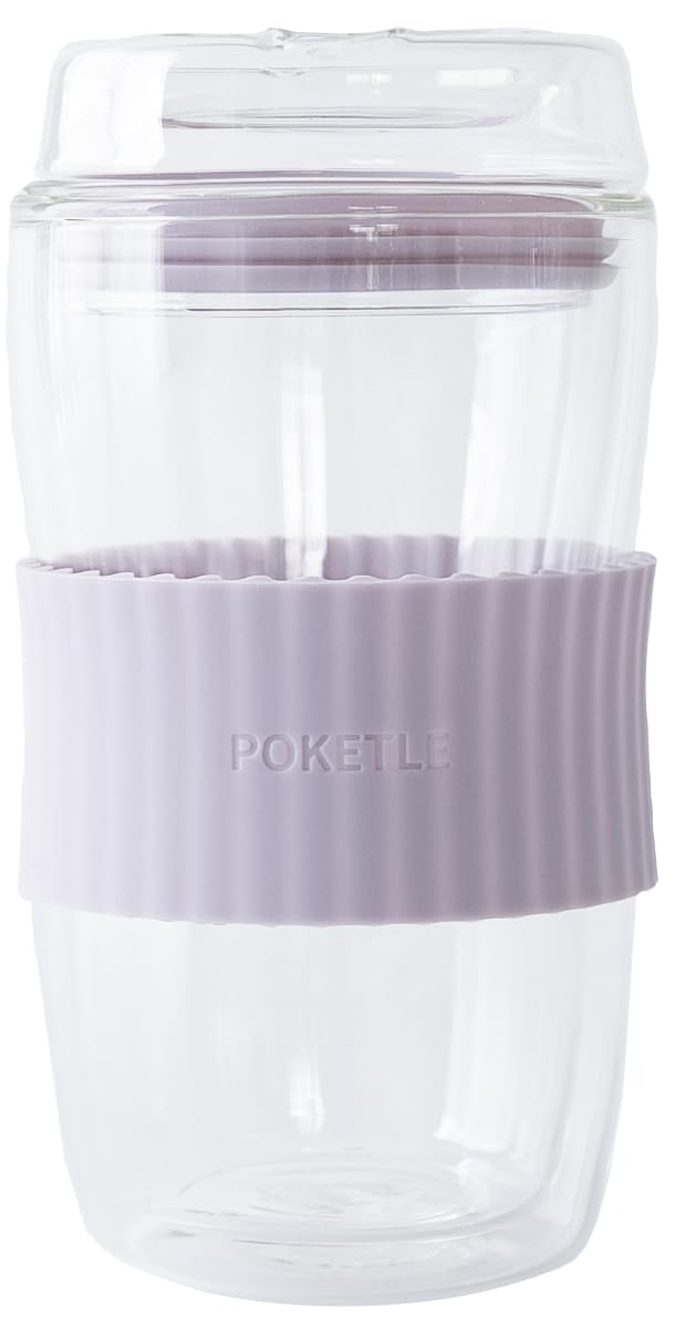 POKETLE Стеклянный тамблер с двойными стенками Посудомоечная машина BPA Бидоро Сиреневая крышка, 330 мл, Стенка, Устойчивый, Безопасный, Свободный, 330, лиловый