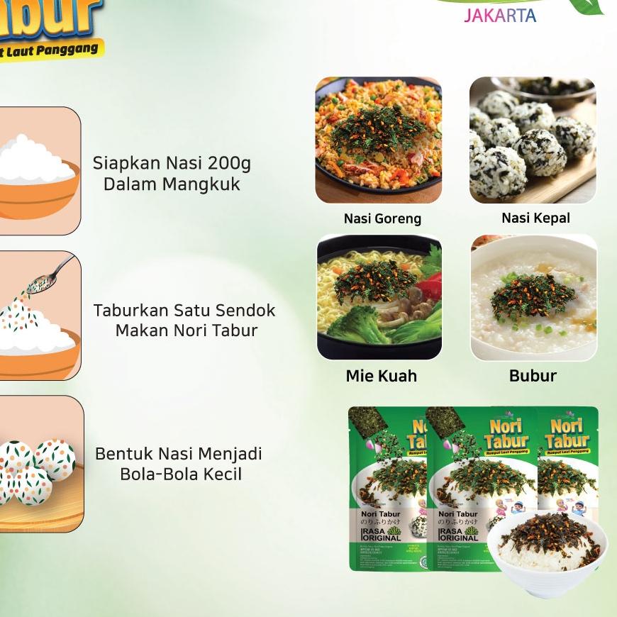 Nori Tabur Rumput Laut Panggang - 60G ⭐⭐⭐⭐⭐ Nori Tabur Java Super Food adalah Nori Tabur yang terbuat dari bahan - bahan yang berkualitas serta memiliki rasa yang enak dan lezat. Seperti Nasi Goreng, Nasi Kepal, Mie Kuah, Bubur dan Lainnya NO BPOM 655628336423 Detail Produk - Rumput Laut Panggang - Gurih dan renyah - Praktis untuk nasi kepal Pengiriman : Senin s/d Jumat max 15.00 sore Sabtu max 11.00 siang ★★★★★ ~~ 2 >>>>>> 12 Terima Kasih Atas Kunjungan Anda 08