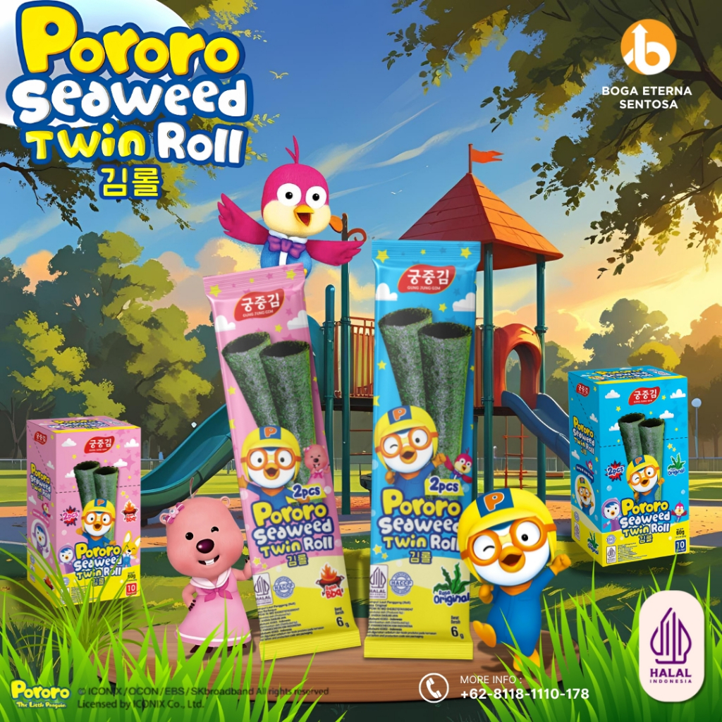 PORORO SEAWEED TWIN ROLL merupakan cemilan dengan bahan dasar rumput laut pilihan yang menghasilkan snack rumput laut yang enak dan renyah.