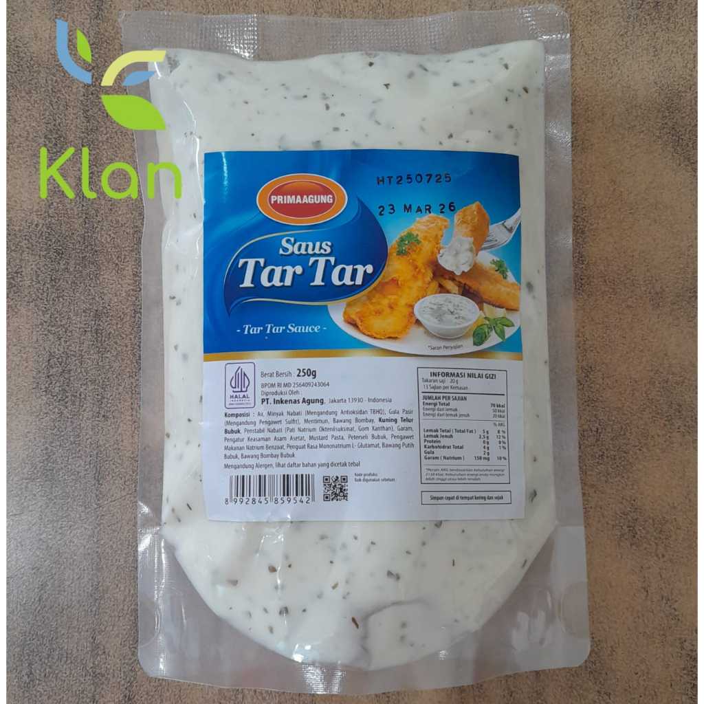 Saus tartar Prima Agung mengandung mayones, acar ketimun, bawang bombay, dan mungkin bahan lainnya seperti parsley.