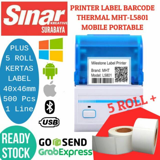 PRINTER BARCODE LABEL STICKER 58MM BLUETOOTH PLUS 5 ROLL KERTAS LABEL