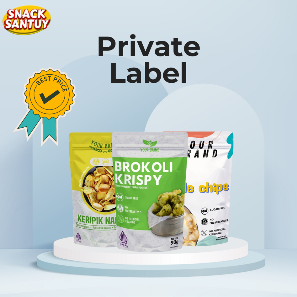 Ingin memiliki produk snack dengan merek sendiri? Snack Santuy hadir dengan solusi private label/maklon keripik buah dan sayur yang mudah dan terjangkau!